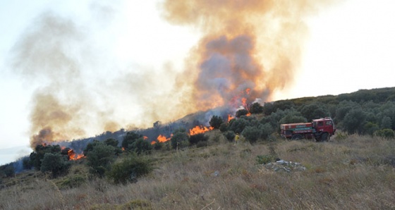 Balıkesir'in Erdek Palata Çeşmesi üst yakası Sığır yolu mevkiinde fundalık ve zeytinlik alanda yangın çıktı.
