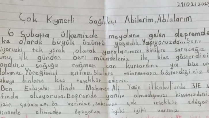 Çocuklar mektuplarında, "Şunu biliyoruz ki tek yürek olarak yaralarımızı birlikte saracağız. Bunu ilk günden beri mücadelenizle bize gösterdiniz. Dondurucu soğuğa rağmen can kurtardınız, bize umut oldunuz, yüreğimizi ısıttınız, size minnettarız. Gösterdiğiniz bu çabaya binlerce kez teşekkür ederiz." ifadelerine yer verdi.