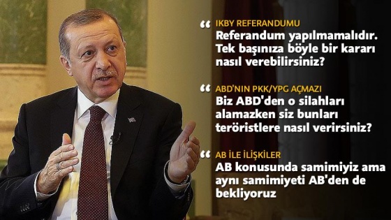 Kuzey Irak olarak tek başınıza böyle bir kararı nasıl verebilirsiniz?IKBY'nin 25 Eylül'de yapmayı planladığı "bağımsızlık referandumu"na değinen Cumhurbaşkanı Erdoğan, şöyle konuştu: