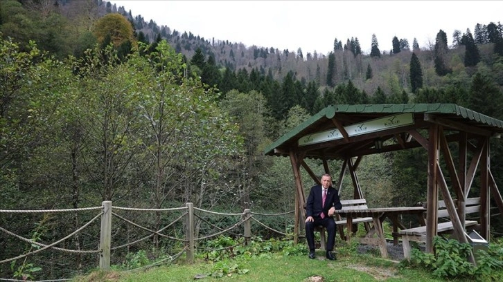 Güneysu ilçesinden helikopterle Ayder Yaylası'na gelen Erdoğan, bölgede yapılan yenileme ve koruma çalışmalarını bir süre havadan inceledi.