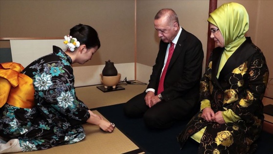 Erdoğan, eşi Emine Erdoğan ile çay seremonisine katıldı. Yere oturan Cumhurbaşkanı Erdoğan ve Emine Erdoğan'a geleneksel kimono giyimli kadınlar, çay servisi yaptı.