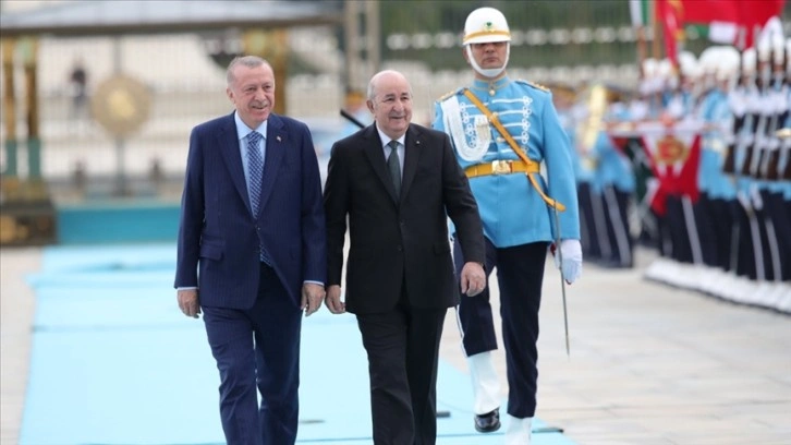 Cumhurbaşkanı @RTErdogan, Türkiye’ye resmî ziyarette bulunan Cezayir Cumhurbaşkanı Abdülmecid Tebbun’u resmî törenle karşıladı. pic.twitter.com/CJB30HIx4C— T.C. Cumhurbaşkanlığı (@tcbestepe) May 16, 2022Erdoğan ve Tebbun'un tören alanındaki yerlerini almalarının ardından, 21 pare top atışı eşliğinde iki ülke milli marşları çalındı. Abdulmecid Tebbun, Muhafız Alayı Tören Kıtası'nı, Türkçe "Merhaba asker" diyerek selamladı.