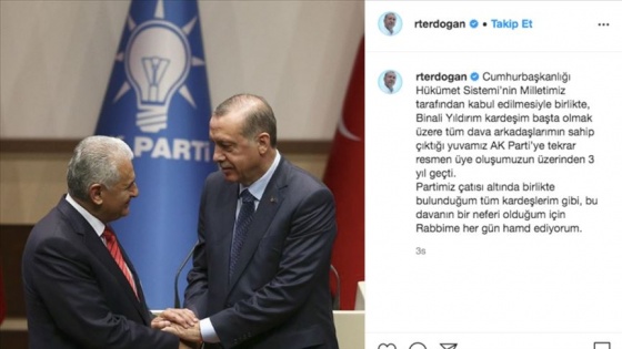 "Cumhurbaşkanlığı Hükümet Sistemi'nin milletimiz tarafından kabul edilmesiyle birlikte, Binali Yıldırım kardeşim başta olmak üzere tüm dava arkadaşlarımın sahip çıktığı yuvamız AK Parti'ye tekrar resmen üye oluşumuzun üzerinden 3 yıl geçti. Partimiz çatısı altında birlikte bulunduğum tüm kardeşlerim gibi bu davanın neferi olduğum için Rabbime her gün hamdediyorum."
