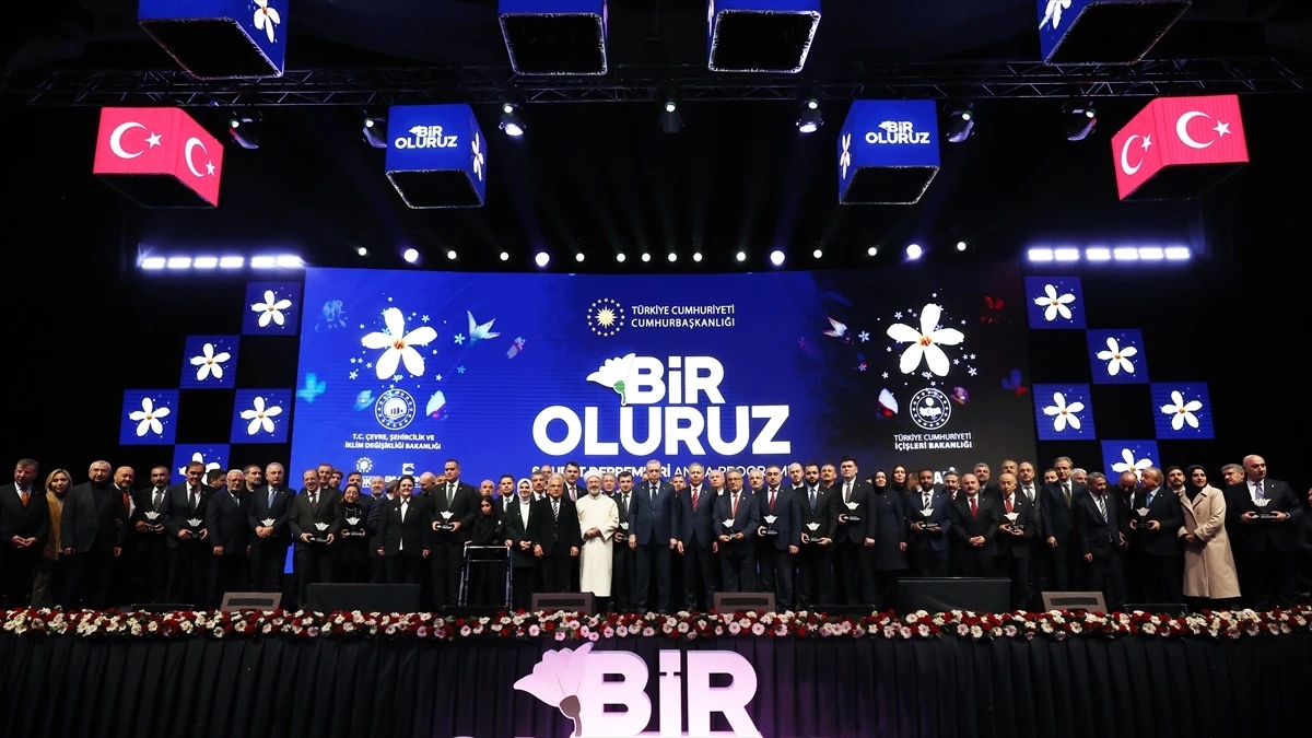 Adıyaman Gençlik ve Spor Müdürlüğü Spor Salonu'nda düzenlenen "Bir Oluruz 6 Şubat Depremleri Anma Programı"nın ardından "asrın birlikteliği"ne katkı sağlayan 42 sektör temsilcisi plaketlerini Cumhurbaşkanı Erdoğan'ın elinden aldı.
