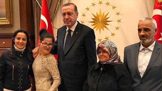 Cumhurbaşkanı Erdoğan, kendisinin portre resmini çizen engelli Gülşah Yağmur Yazıcı'yı Cumhurbaşkanlığı Külliyesinde kabul etti.