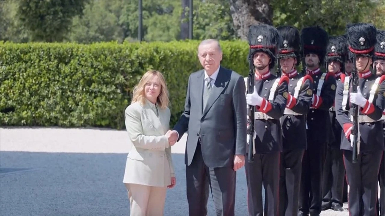 Erdoğan ve Meloni, tören kıtasının selamlanmasının ardından tokalaşarak basın mensuplarına poz verdi.
