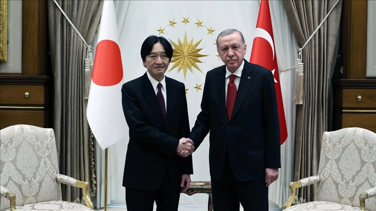 Erdoğan ve Akishino, Türkiye ve Japonya bayrakları önünde tokalaşarak poz verdi.