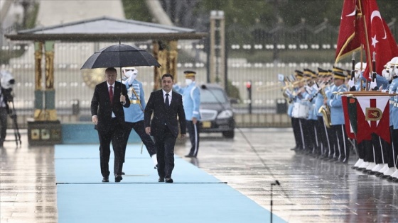 Yoğun yağmurda gerçekleşen törende Cumhurbaşkanı Erdoğan, Caparov'u giriş kapısında karşıladı.