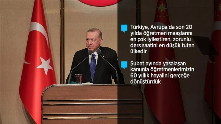 Cumhurbaşkanı Erdoğan "Türkiye, Avrupa'da son 20 yılda öğretmen maaşlarını en çok iyileştiren, zorunlu ders saatini de en düşük tutan ülkedir. Öğretmenlerimizin mali ve özlük hakları konusunda gözle görülür ilerlemeler kaydettik." dedi.