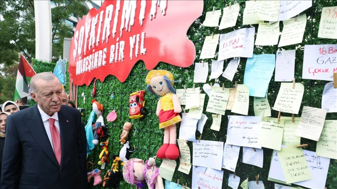 Cumhurbaşkanı Erdoğan: İsrail 1 yıldır uyguladığı soykırımın bedelini er ya da geç ödeyecektirErdoğan, burada AK Parti Genel Merkez Kadın Kolları tarafından, partinin Söğütözü Caddesi girişindeki avlu duvarı üzerinde oluşturulan "Soykırımın Gölgesinde Bir Yıl" anma panosunu ziyaret etti.
