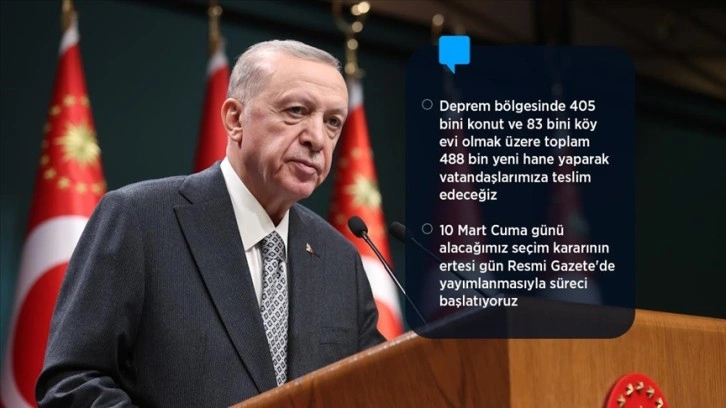 "Kahramanmaraş, Hatay, Adıyaman, Malatya, Gaziantep, Osmaniye, Kilis, Adana, Şanlıurfa, Diyarbakır, Elazığ için 'Hemen şimdi' diyoruz. Bunlarla birlikte ülkemizin diğer 70 vilayetinin her biri için 'Hemen şimdi' diyoruz. 10 Mart Cuma günü Anayasa'nın bize verdiği yetkiye dayanarak alacağımız seçim kararının, ertesi gün Resmi Gazete'de yayımlanmasıyla süreci başlatıyoruz. Tabii bu kararın yayımlandığı 11 Mart itibarıyla seçim takvimi ile ilgili hususlar Yüksek Seçim Kurulunun (YSK) yetki alanına girmektedir.