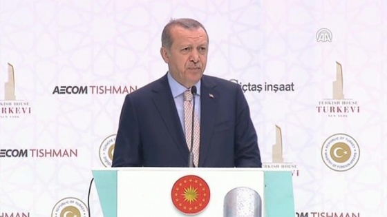 Cumhurbaşkanı Erdoğan, New York'ta yeni Türkevi binasının temel atma töreninde konuşuyor.