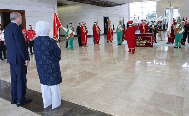 Öğrencilerin gerçekleştirdiği mehter takımı gösterisini eşi Emine Erdoğan ile izleyen Cumhurbaşkanı Erdoğan, zaman zaman mehter marşına eşlik etti.