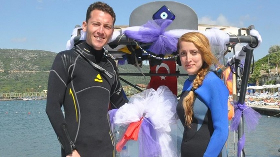 İlçedeki bir dalış eğitim merkezinin eğitimleri sırasında tanışan Mihriban Sayan (27) ile Gökhan Sarıoğlu (35), gelinlik ve damatlık giyip teknede "temsili nikah töreni" gerçekleştirdi.