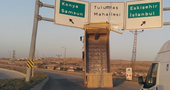 Kaza sabah saatlerinde Gölbaşı’nda meydana geldi. Edinilen bilgilere göre; güney çevre yolu üzerinde Konya istikametinde seyreden boş hafriyat kamyonu, sürücünün dalgınlığı nedeniyle damperi açık bir şekilde ilerledi. Tulumtaş Mahallesi yol ayrımındaki tabelaya damperi takılan kamyonun ön tekerleri yerden kesildi. Şaha kalkan kamyonun sürücüsü kazayı şans eseri yara almadan atlattı. Kamyonda maddi hasar meydana gelirken, yön tabelası da devrilme tehlikesi atlattı.