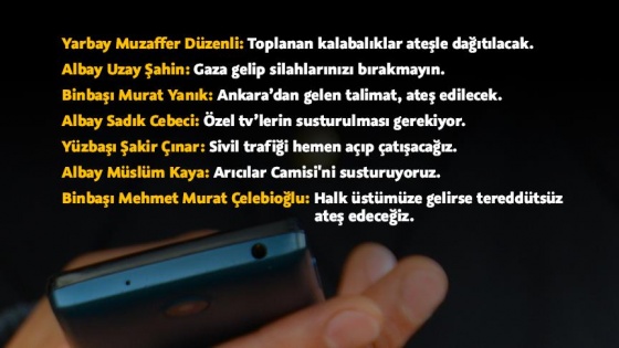 - Yüzbaşı Şakir Çınar: Sabiha Gökçen sivil trafikten dolayı nizamiyeye giremiyoruz. Ayrıca Polis Özel Harekat çatışacağız diyormuş jandarmaya. Sivil trafiği hemen açıp çatışacağız.