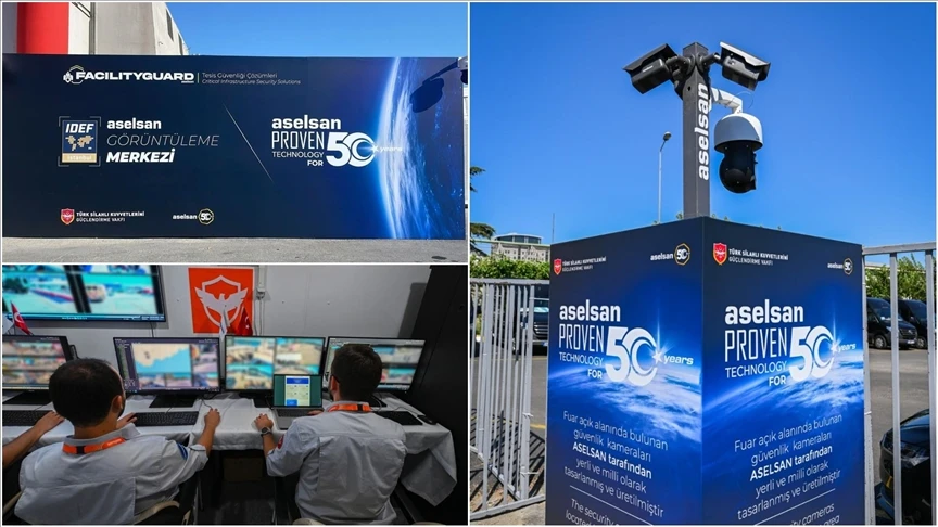 IDEF 2025 özelinde entegre ve konfigüre edilebilir güvenlik sistemi devreye alındı. Fuar alanlarında 21 direk üzerine yerleştirilen 32 hareketli ve 63 sabit kameraya ek olarak 8 giriş noktasında kurulan 27 yüz tanıma kamerasıyla toplam 122 kamera kullanıldı. Ayrıca tüm alanlar, ASELSAN görüntüleme merkezine bağlanarak yerli ve milli yazılımlar aracılığıyla izlendi.