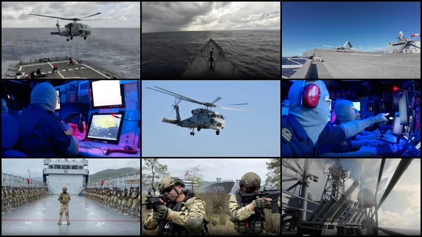 "Denizkurdu-I/2025 Tatbikatı, tüm çevre denizlerimizde devam ediyor. Tatbikat kapsamında 8 Ekim 2025 tarihinde, fiili silah atışları, denizaltı savunma harbi, helikopter ile dikey ikmal, amfibi çıkarma, deniz kirliliği, orman yangınları ile mücadele eğitimleri başarıyla icra edildi. Ayrıca, Bayraktar TB3 İHA ile gece şartlarında TCG Anadolu'ya iniş kalkış eğitimleri gerçekleştirildi."