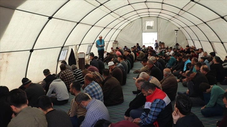 Çadır mescitte kılınan namaz öncesi vaaz verildi, depremlerde hayatını kaybedenler için dua okundu.