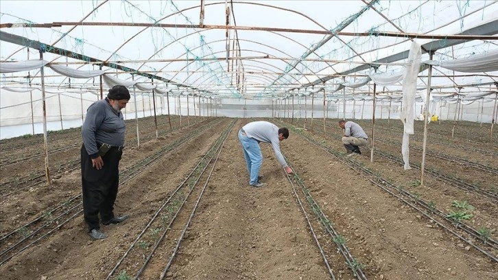 Seracılığın yoğun yapıldığı Kadıoğlu Çiftliği Mahallesi'ndeki çiftçiler, afetten etkilenseler de üretimin sürekliliği için seralarda domates ve salatalık fidelerini toprakla buluşturuyor. Besiciler de koyun ve keçi sürülerini meralara çıkarıyor.
