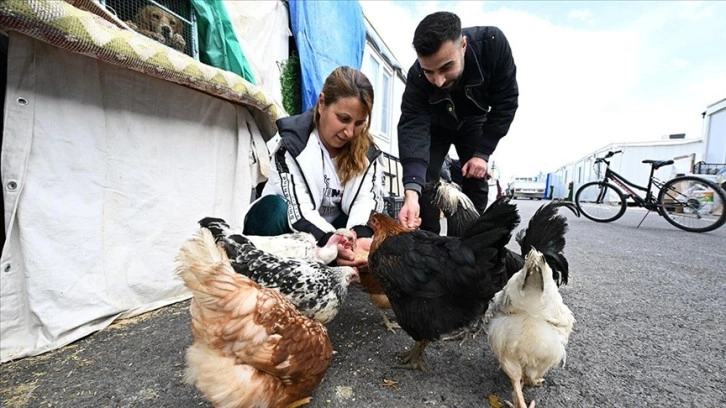 Depremde sevdiklerinin yanı sıra evlerini kaybettiklerini ifade eden Karagöz, "Depremden dolayı kafamızı dağıtmak istediğimiz şeyler arıyorduk. Biz de bunu hayvanlarda bulduk. Tavuklar, köpekler, kedim var. Kendi çaplarında bir alan oluşturduk ve besliyoruz. Komşularımızda ilk önce ön yargı oldu, şikayetler oldu ama onlar da alıştılar ve sevdiler." diye konuştu.