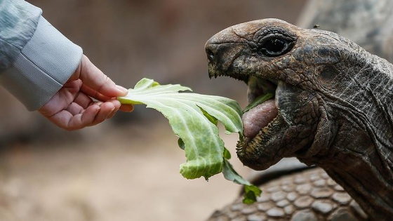 Turistlerin ahşap botlarla ulaştığı adada ziyaretçiler dev kaplumbağaları elleriyle besliyor.