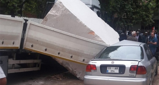 Mersin'in Erdemli ilçesinde seyir halindeki tırda yüklü mermer blok park halindeki otomobilin üzerine düştü.