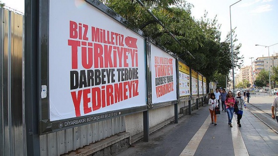 Fetullahçı Terör Örgütü'nün (FETÖ) darbe girişimi ile terör örgütü PKK'nın saldırılarına tepki cadde ve sokaklardaki billboardlara asılan, "Biz milletiz Türkiye'yi darbeye teröre yedirmeyiz" yazılı afiş Diyarbakır'da memnuniyetle karşılandı.Terör örgütleri FETÖ ve PKK'ya karşı tepki içeren mesajlardan duydukları mutluluğu dile getiren vatandaşlar, darbe ve teröre karşı tek yürek olduklarını belirtti.