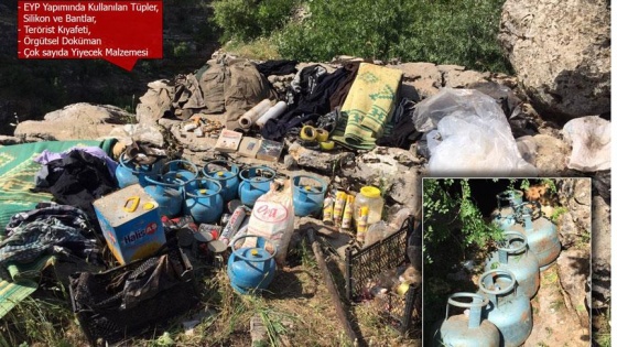 Teröristlere ait sığınakta el yapımı patlayıcı yapımında kullanılan 22 mutfak tüpü, 10 silikon, 20 koli bandı, terörist kıyafeti bulunurken, 100 kilogram amonyum nitrat ve alüminyum tozu kullanılarak tuzaklanmış el yapımı patlayıcı düzeneği yerinde imha edildi.