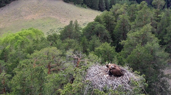 Kars'ın Sarıkamış ilçesinde çok sayıda yabani hayvan türüne barınma imkanı sunan sarıçam ormanlarında kendilerine yaşam alanı oluşturan iki akbaba, çam ağacının tepesine yaptıkları yuvada yavrularını büyütüyor.