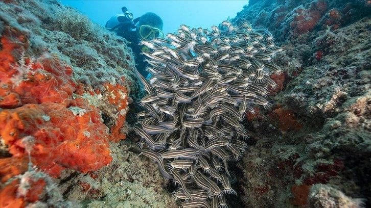 Çok sayıda canlı türüne ev sahipliği yapan Doğu Akdeniz'deki koylarda, çizgili kedi balıklarının sürüler halinde hareket ettiği görüldü.
