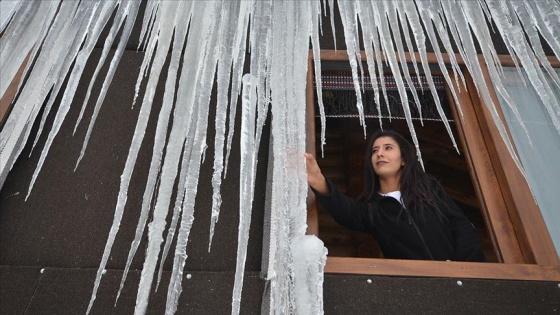 Sarıkamış ilçesinde binaların çatılarında 5 metreyi bulan buz sarkıtları oluştu.