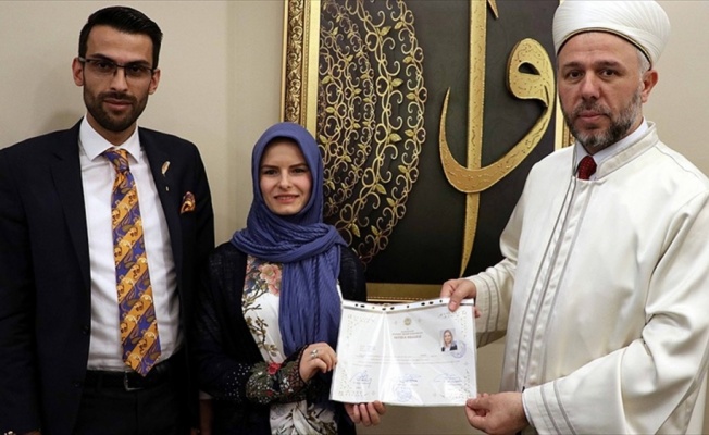 KAYSERİ (AA) - Kayseri İl Müftüsü Şahin Güven'in makamında gerçekleştirilen ihtida törenine eşi Ömer Yavuz ile katılan 28 yaşındaki Litvanya uyruklu Jurgita Kerbelyte, Kelime-i Şehadet getirerek Müslüman oldu. Kur'an-ı Kerim okunmasının ardından Güven, İslam dininin temel esaslarıyla ilgili bilgiler verdi ve dua etti.
