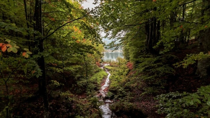 Kayın ve meşe ağaçlarının, derelerin bulunduğu Domaniç Dağları'ndaki renk değişimi dronla görüntülendi.
