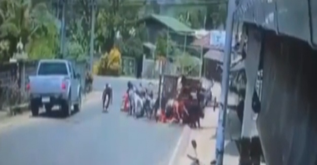 Gülümseten kaza olur mu demeyin ? Bu kaza istisna. Tayland’da işçileri taşıyan pappat virajı alamayınca devrildi. Araca balık istifi binen işçiler de araçtan düştü. Yolcular domino etkisiyle savrulunca ortaya bu görüntüler çıktı. Düştükleri yerden kalan işçiler, daha sonra tekrar araca binerek yollarına devam etti.