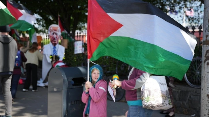 Otelin önünde, İrlanda Filistin Dayanışma Derneği tarafından düzenlenen gösteride, "ABD'nin İsrail’in Gazze'de gerçekleştirdiği soykırımdaki ortaklığını" bitirmesi talep edildi.