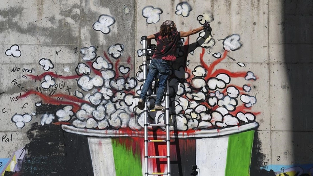 Mengü, Gazze'de yaşanan insanlık dramına tepkisiz kalan ülkelerin sinema izler gibi yaşananları seyrettiklerini anlattığı duvar resmiyle hem savaşın gölgesinde yok edilen yaşamları hem de uluslararası toplumun sessizliğini sanatın diliyle anlatmayı amaçlıyor.