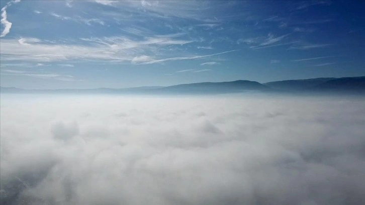Düzce Ovası'nın üzerini kaplayan sis bulutu, dron ile görüntülendi.