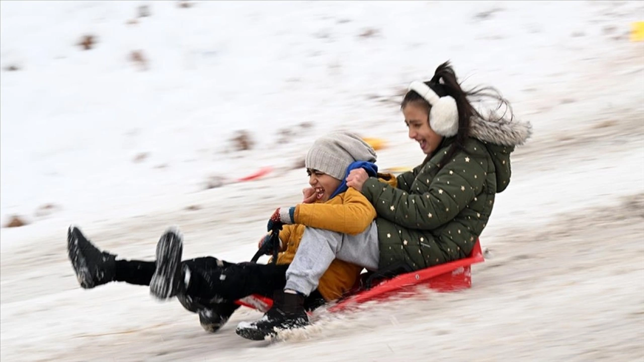 Kar yağışı ve beraberinde gelen tatili fırsat bilen çocuklar, Rıfat Yıldırım Parkı'ndaki eğimli arazide kızakla kayarak vakit geçirdi.