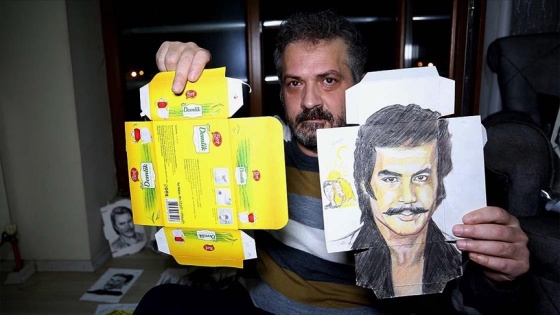 Yeni tip koronavirüs (Kovid-19) sürecinde risk grubunda olduğu için Düzce'de yalnız yaşadığı evden dışarı çıkmadan sanatını sürdüren Canbaz, atık çay, şeker, yumurta ve ilaç kutuları ile tahta parçalarının üzerine sevdiği sanatçıların resmini çizmeye başladı.