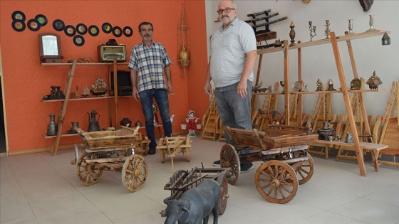 Uyar ve Vergili'nin ahşaptan yaptığı objeler arasında unutulmaya yüz tutan at arabası, kağnı ve oyuncaklar ilgi görüyor.