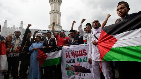 Başkent Cakarta'da cuma namazası sonrası toplanan yüzlerce kişi, ellerindeki Filistin bayraklarıyla ABD’nin Cakarta Büyükelçiliği önünde toplandı.