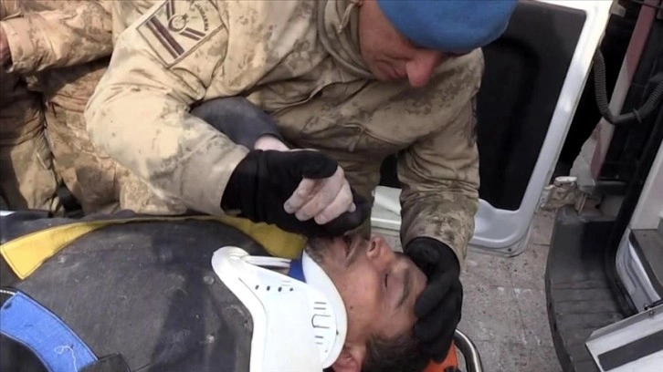 Ali İbrahim, ambulansa bindirileceği sırada kurtarma ekibinde görevli uzman jandarma Murat Şahin'in elini öptü.
