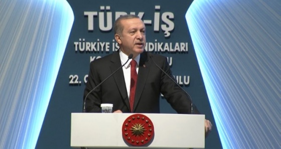 Cumhurbaşkanı Erdoğan, Büyük Anadolu Otel’de düzenlenen Türkiye İşçi Sendikaları Konfederasyonu 22. Olağan Genel Kurulu’nda konuştu. Türkiye’nin en büyük iş sendikası olan Türk-İş’in 22. Genel Kurulu’nun hayırlı olmasını dileyen Erdoğan, "Emekleriyle alın teriyle bu ülkenin gelişmesine, kalkınmasına, büyümesine, güçlenmesine katkıda bulunan işçi kardeşlerimizin o her birinin o pak alınlarından öpüyorum" dedi.
