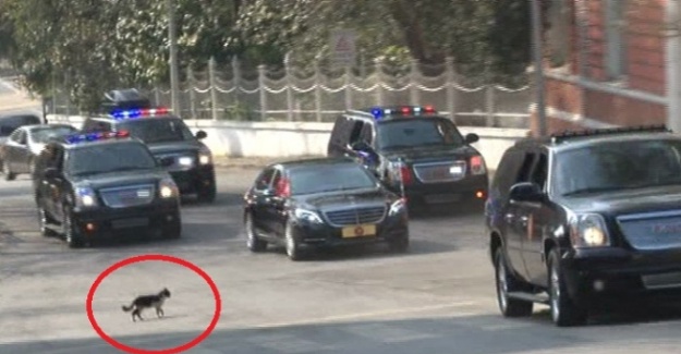 Konvoyun geçişi sırasında yola aniden çıkan bir kedi, koruma araçları tarafından son anda fark edildi. Polis ve korumaların nezaretinde yolun karşısına geçen kedi, yoluna devam etti..Cumhurbaşkanı Recep Tayyip Erdoğan, Haliç Kongre Merkezi’ndeki programının ardından Kulüpler Birliği Vakfı üyeleri ile görüşmek üzere Yıldız’daki Mabeyn Köşkü’ne gitti. Cumhurbaşkanlığı konvoyunun köşke gireceği sırada yola aniden çıkan ve karşıya geçmek isteyen bir kedi, ilginç görüntülere neden oldu.