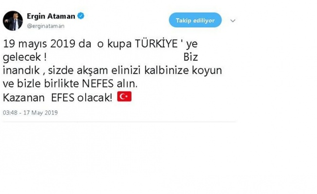 THY Euroleague Final-Four öncesi Ergin Ataman sosyal medya hesabından açıklama yaptı. Deneyimli Başantrenör, yaptığı paylaşımda “19 Mayıs 2019’da o kupa Türkiye’ye gelecek. Biz inandık, siz de akşam elinizi kalbinize koyun ve bizle birlikte Nefes alın. Kazanan Efes olacak" notunu paylaştı.