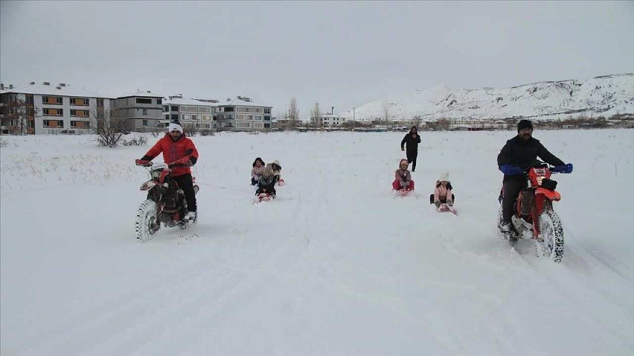 Motosiklet tutkunu ve kayak antrenörü Cansel Atilla ile Recep Sulu, Menderes Mahallesi'nde karla kaplanan boş arazide toplanan çocukların kızaklarını iple kros motorların arkasına bağladı.