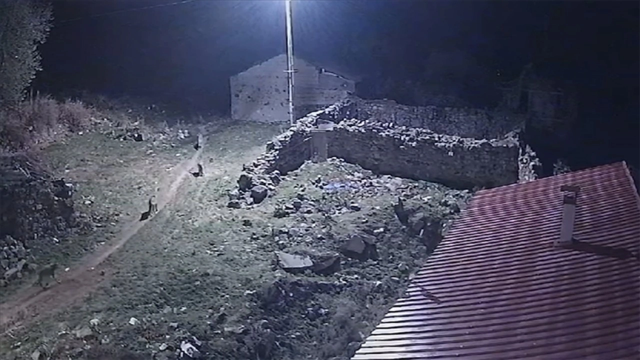 Görüntülerde, kurtların gece saatlerinde yolda ilerlemesi ve çevrede yiyecek araması yer alıyor.