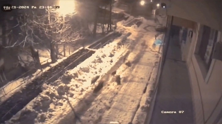 Kurtların evlerin arasında dolaşıp yiyecek aradığı anlar çevredeki güvenlik kamerası görüntülerine yansıdı.