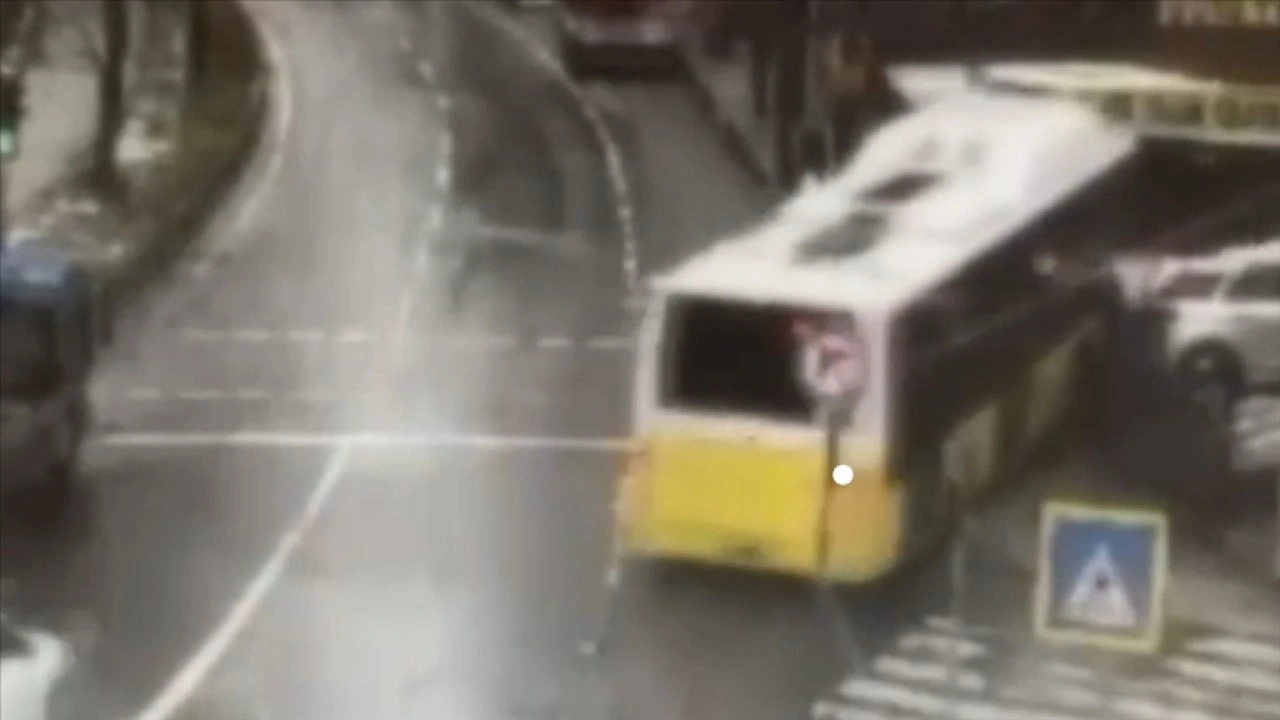 Güvenlik kamerasınca kaydedilen görüntüde, kaldırımda yürüyen bir kişinin otobüsün altında kalmaktan son anda kurtulduğu görülüyor.